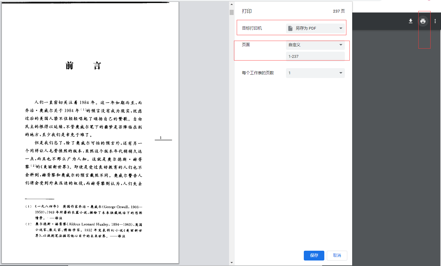 3.使用谷歌浏览器打开PDF,选择右侧的打印,里面有另存为PDF,再选定指定的页面即可