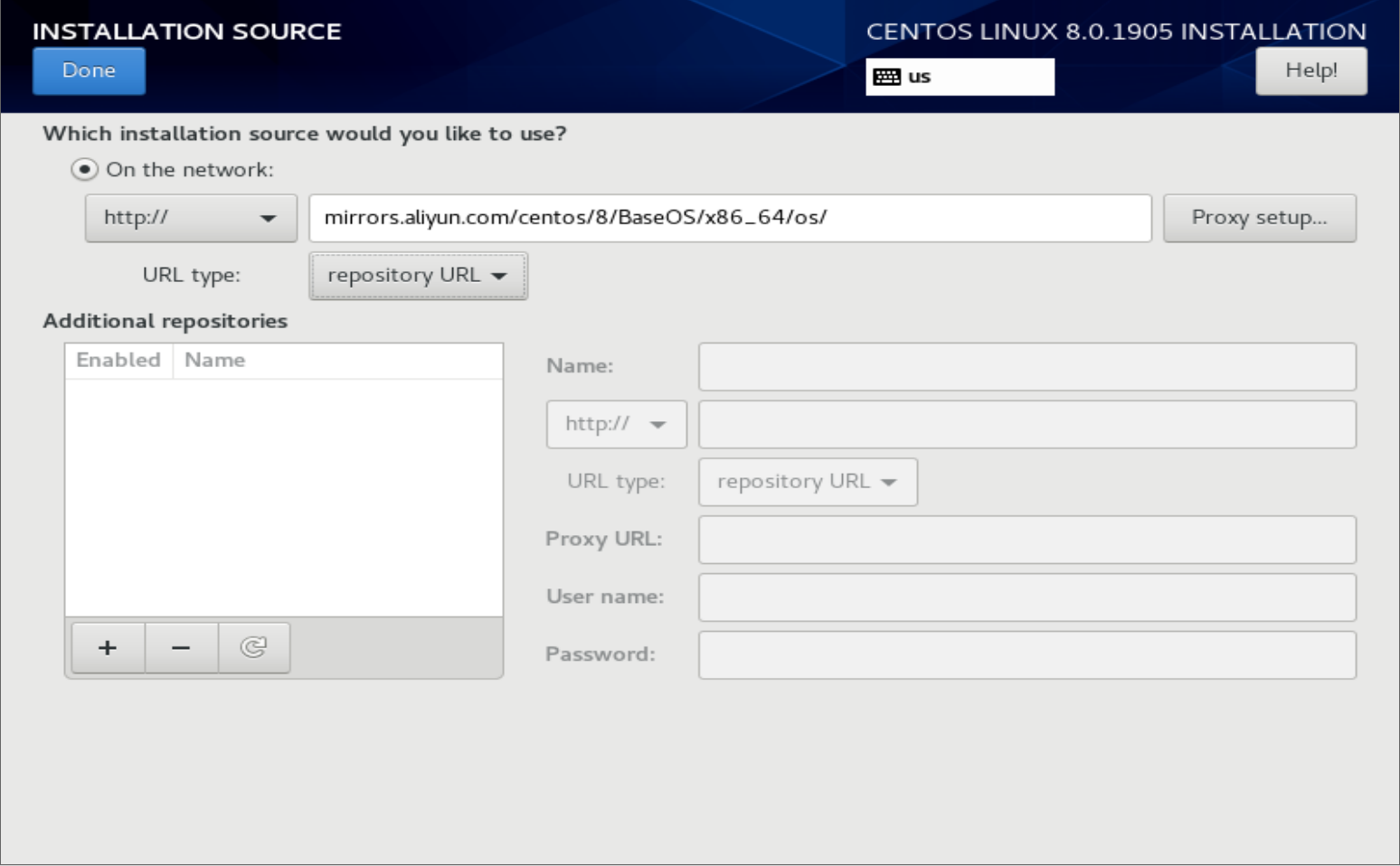 网络地址填写下面即可:http://mirrors.aliyun.com/centos/8/BaseOS/x86_64/os/